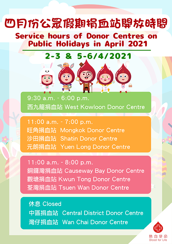 香港紅十字會輸血服務中心呼籲市民在復活節和清明節假期期間捐血,市民亦可登記加入骨髓捐贈者資料庫,為病友送上祝福。