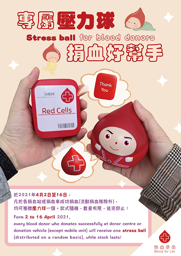 輸血服務中心透露,在4月2至16日於捐血站或捐血車捐血之市民可獲贈一個「壓力球」一個,中心指它是在捐血時使用、有助血液流通順暢,而紀念品會分兩款設計,款式隨機派發,數量有限,送完即止。