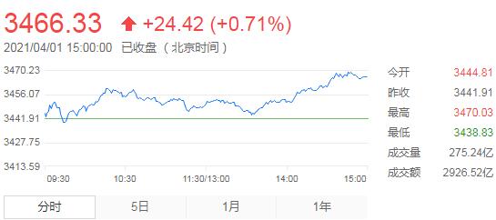 截至收盤,滬指漲0.71%,報3466.33點,深成指漲1.46%,報13979.69點,創業板指漲2.06%,報2815.41點。滬深兩市成交額6576.8億元。兩市99股漲停,17股跌停(含ST)。