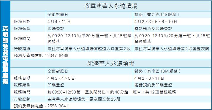 清明節將至,華人永遠墳場管理委員會(華永會)公布全新服務及設施,將軍澳及柴灣華人永遠墳場推行節日限定免費電動車服務助有需要人士掃墓,並於年內在將軍澳華人永遠墳場推出第二個全新撒灰紀念花園。