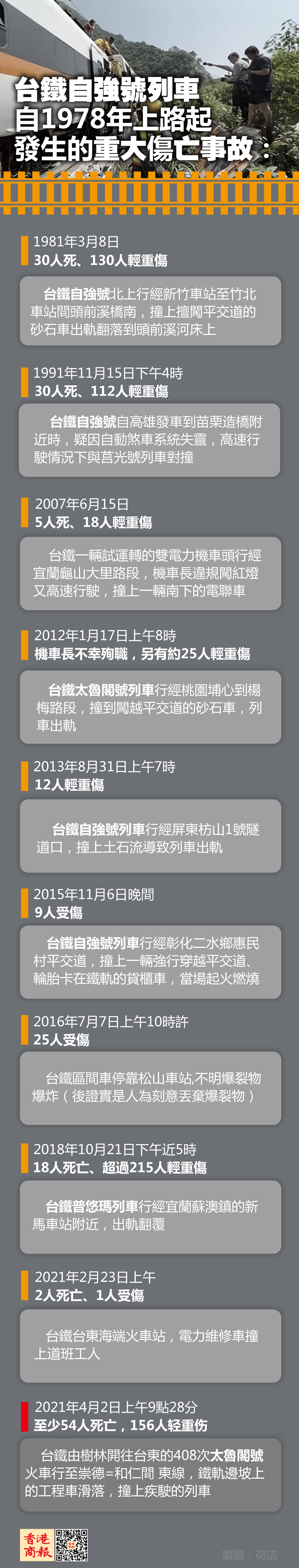台鐵自強號列車從1978年上路,過去40多年來,台鐵發生的重大傷亡事故: