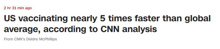 據美國有線電視新聞網(CNN)當地時間5日報道,分析顯示,美國目前接種新冠病毒疫苗的速度幾乎是全球平均速度的5倍,而且已經完全接種的人口比例超過了大多數接種相同時間的國家。