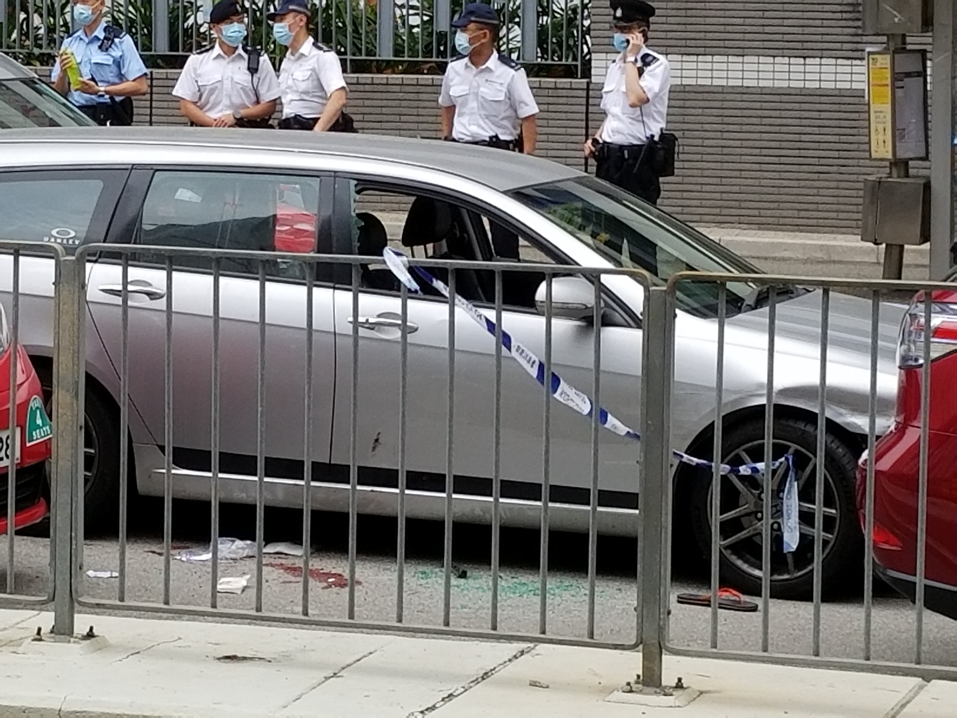 警員追至擎槍警告不果,向私家車鳴槍一響,司機肩膊中槍,多名警員上前制服司機,他被捕後清醒送院,大批警員現時仍封鎖銀城街進行調查。(記者 區天海)