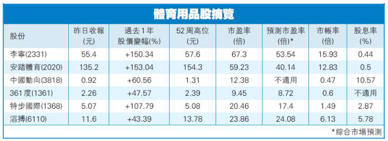 回顧過去一年,李寧及安踏股價分別累漲150.34%及153.04%。隨着疫情逐步受控,奧運的即將到來讓大眾對運動參與度提高,加上政府的政策支援及體育用品公司在產品、品牌及線上管道的策略提升,市場對體育用品行業未來的銷售潛力抱正面態度。