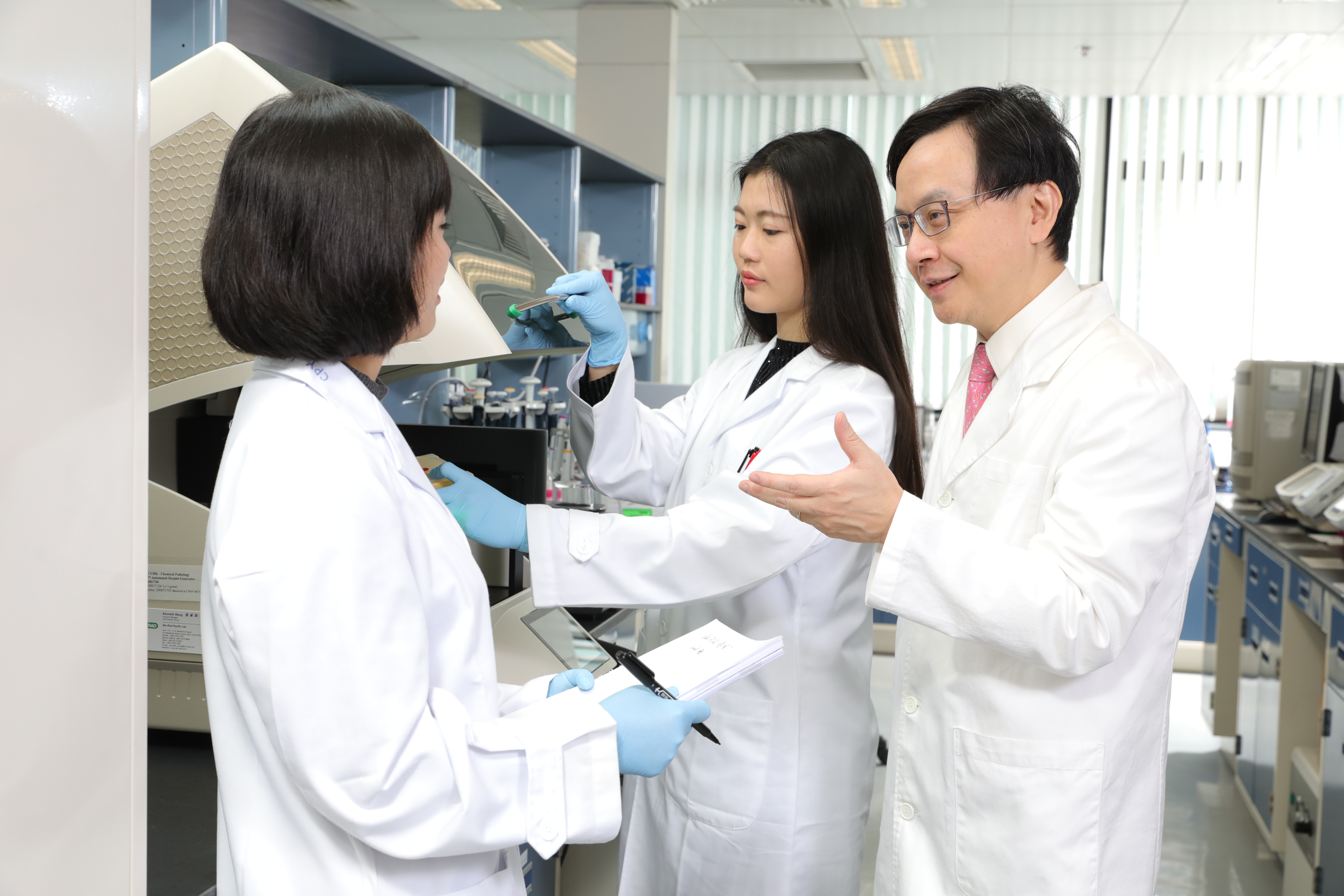 頂圖:中大李嘉誠健康科學研究所所長盧煜明向基金會主席李嘉誠介紹利用血漿作癌症檢測的技術;右二為中文大學副校長霍泰輝。