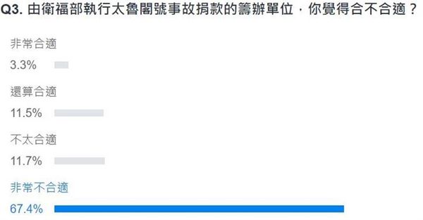 至於由衛福部執行太魯閣號事故捐款的籌辦的部分,有3.3%網友認為非常合適,還算合適的有11.5%,覺得不太合適的有11.7%,而認為非常不合適的網友則高達67.4%,另外有6.1%網友沒表達明確意見。