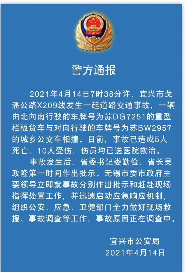 14日7時38分許,宜興市戈潘公路X209線,一輛由北向南行駛的車牌號為蘇DG7251的重型欄板貨車與對向行駛的車牌號為蘇BW2957的城鄉公交車相撞。目前,事故已造成5人死亡,10人受傷,傷員均已送醫院救治。