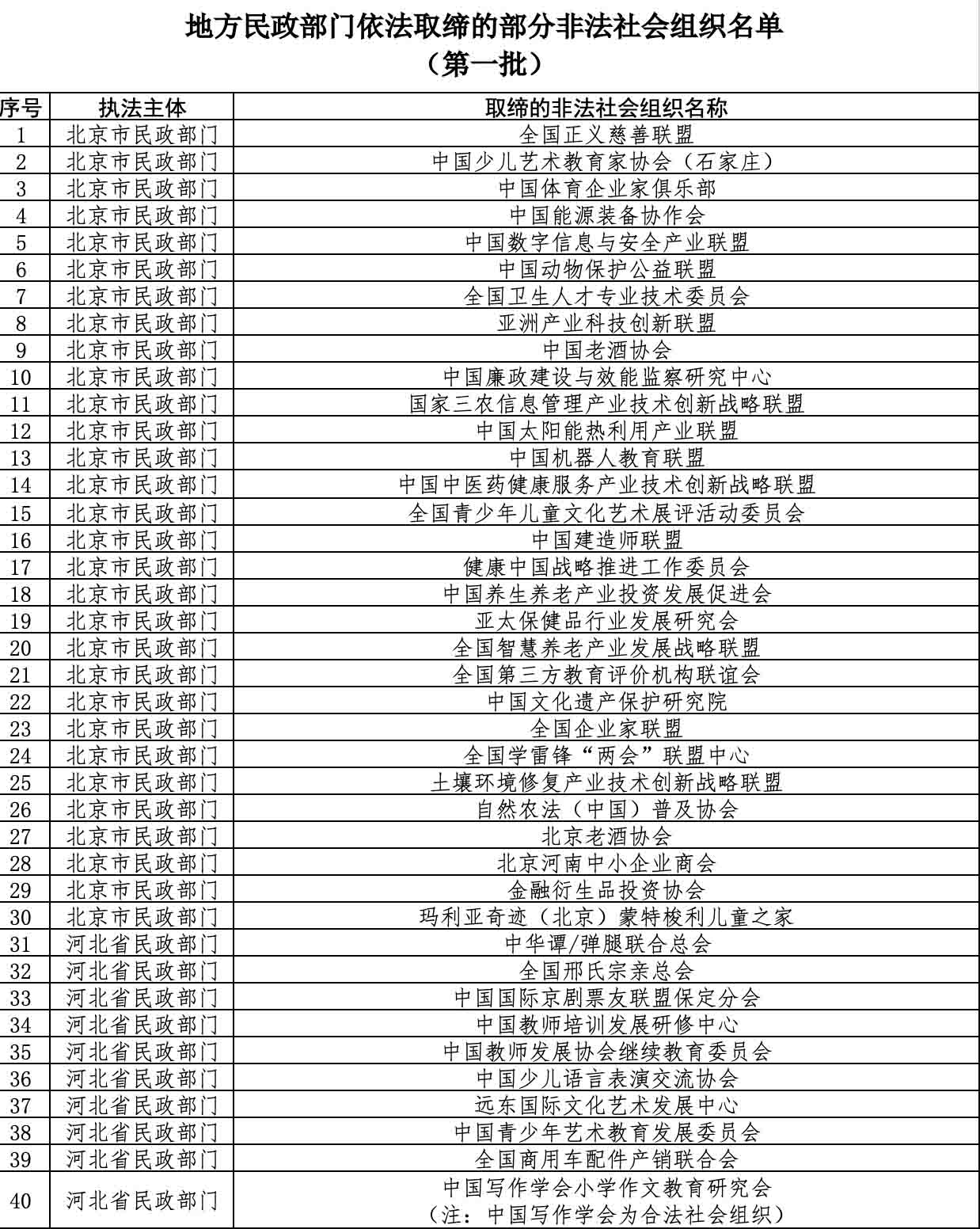 據央視新聞報道,民政部今天(16日)公布了78家地方民政部門近年來依法取締的部分非法社會組織名單。社會公眾如果發現名單中的非法社會組織仍在開展活動的,可依法向公安機關報案。同時,提醒有關機構和社會公眾,在與社會組織開展合作或參與其活動時,請通過「中國社會組織政務服務平台」(www.chinanpo.gov.cn)、「中國社會組織動態」政務微信(微信號:chinanpogov)核實其身份,避免上當受騙;也歡迎社會各界通過「中國社會組織政務服務平台」提供涉嫌非法社會組織活動線索。