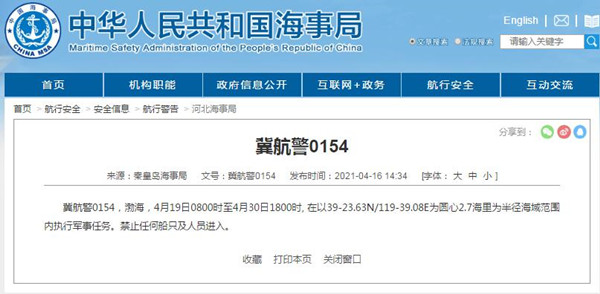 據中國海事局網站消息,16日,冀航警0154,渤海,4月19日0800時至4月30日1800時, 在以39-23.63N/119-39.08E為圓心2.7海里為半徑海域範圍內執行軍事任務。禁止任何船隻及人員進入。