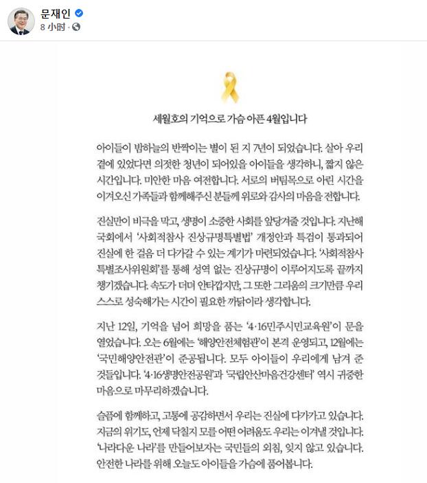 文在寅寫道,唯有查明真相才能防止悲劇重演,早日迎來以生命為重的社會。政府將精心完成四一六生命安全公園和國立安山心理健康中心建設任務。