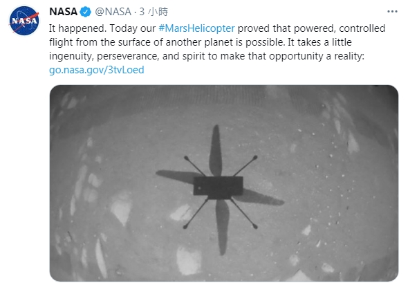 NASA在推特上說:「『機智』號進行了首次飛行,這是飛行器在另一個星球上的首次飛行。」