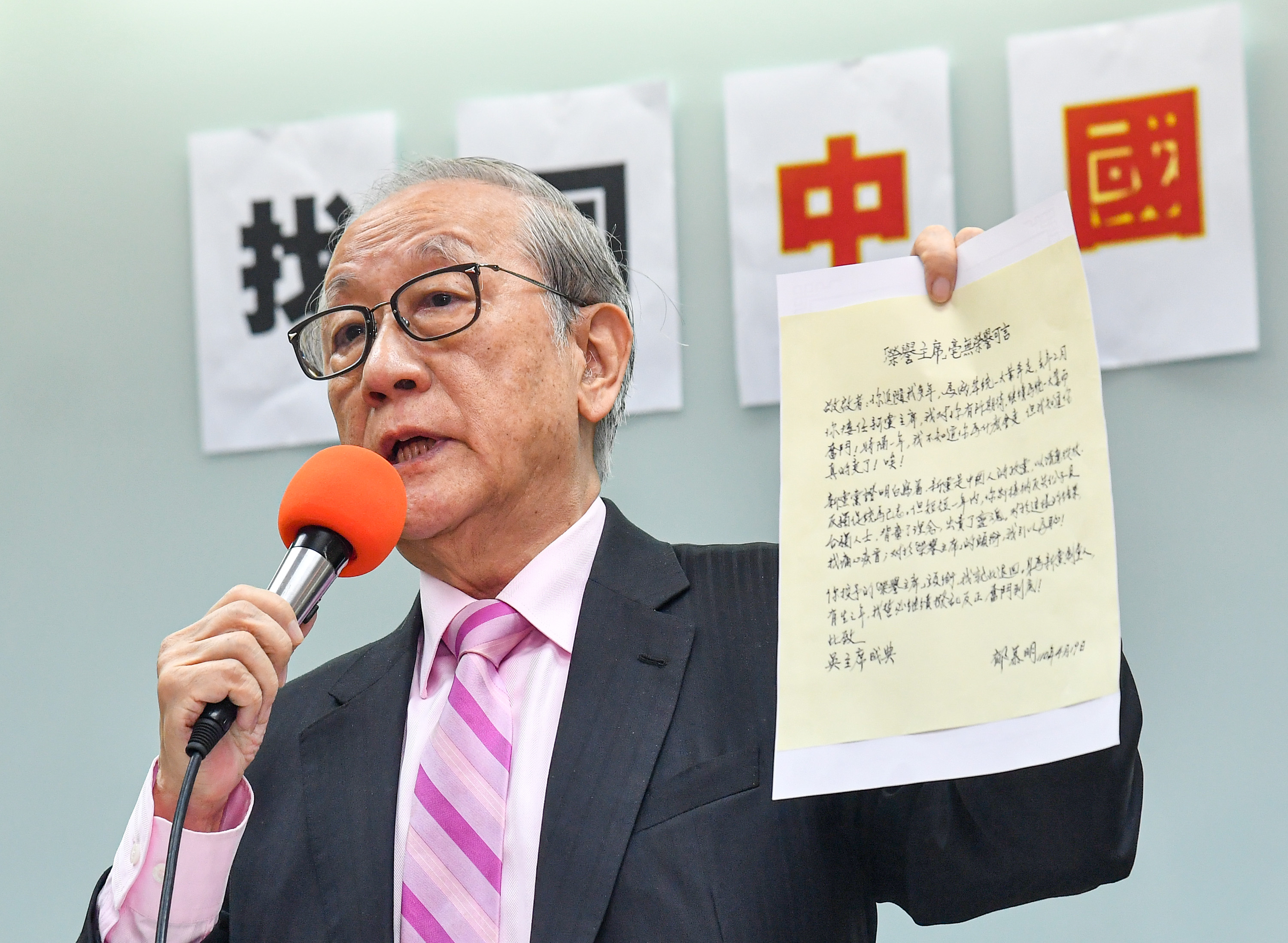 新黨榮譽主席郁慕明(中)19日表示,新黨主席吳成典接納台獨人士,背棄新黨理念,對於新黨榮譽主席的頭銜,他引以為恥,決定退回。中央社 郑清元摄
