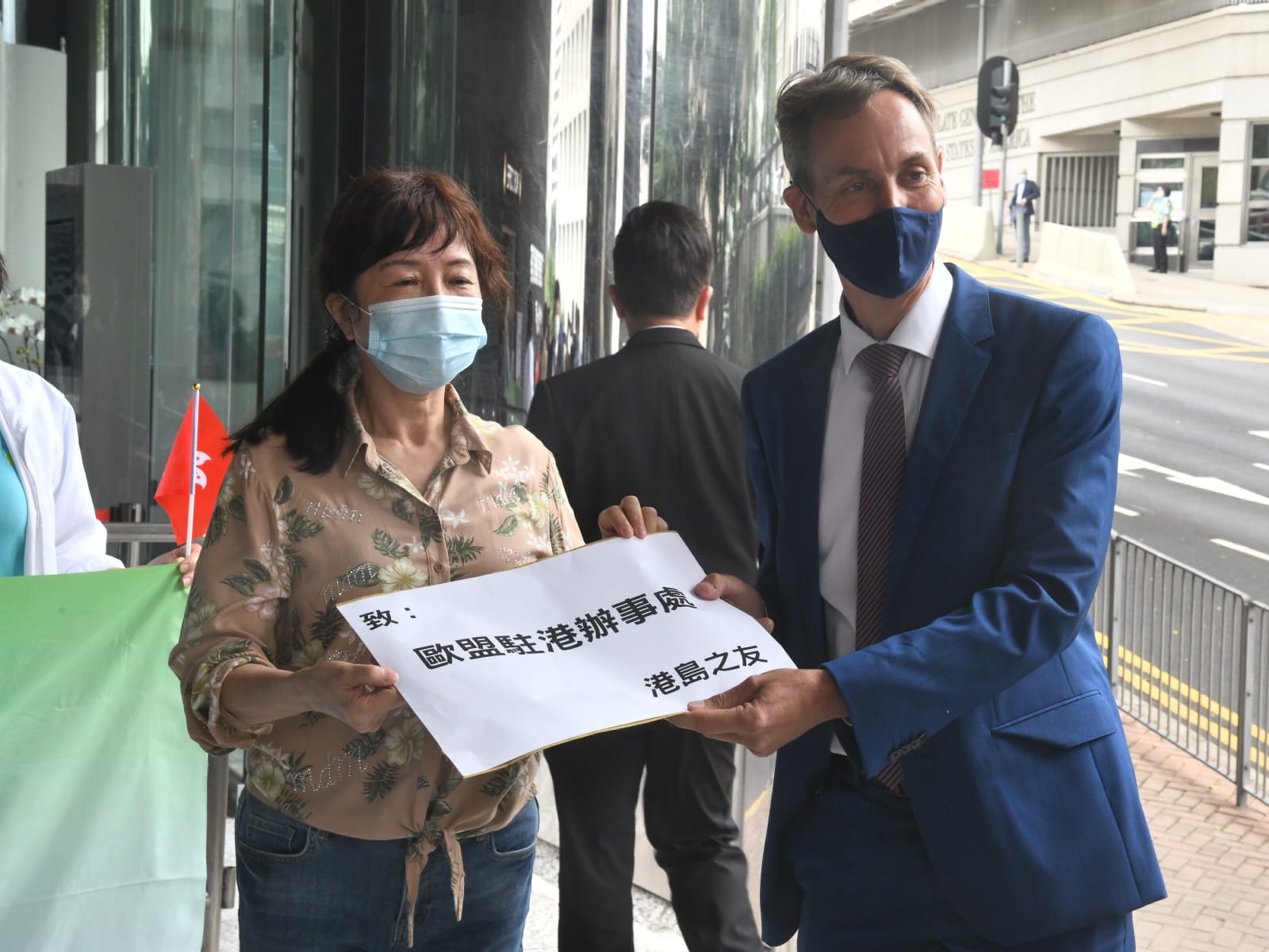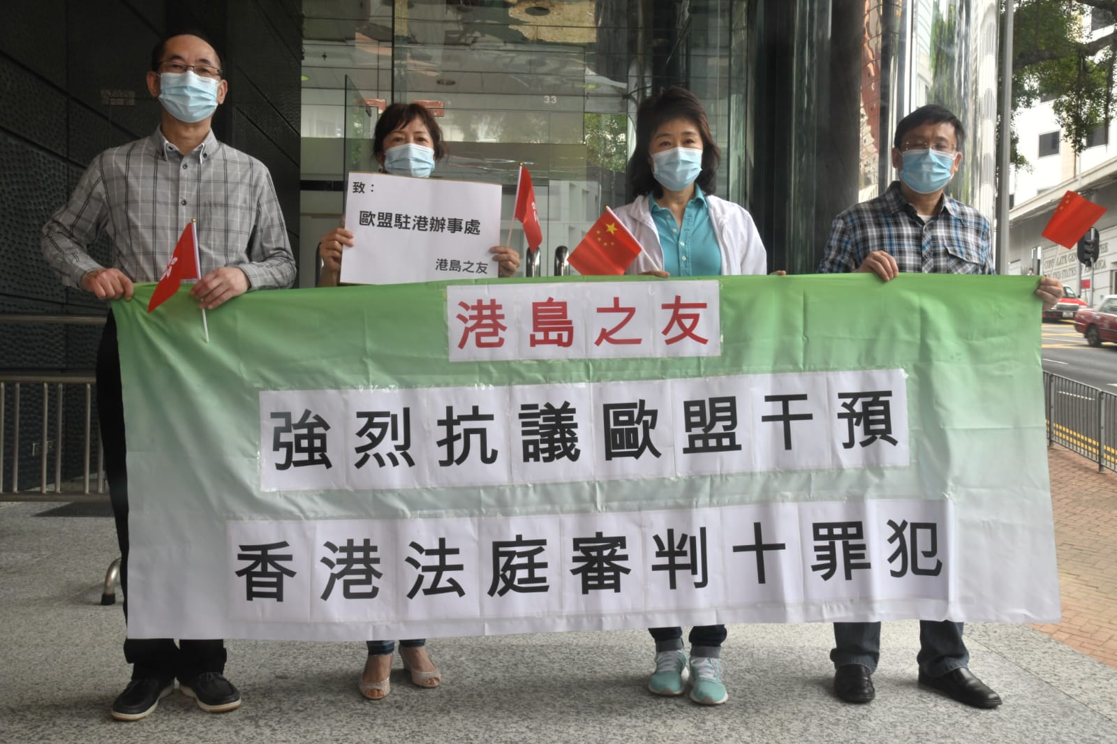 團體「港島之友」今日(20日)到歐盟駐港辦事處請願,抗議歐盟干預本港法庭審判黎智英等10名反對派人士涉8·18非法集結案。