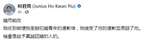 何君堯今早在社交媒體上傳由該名男生所寫的道歉信照片,並指會原諒真誠認錯的人。