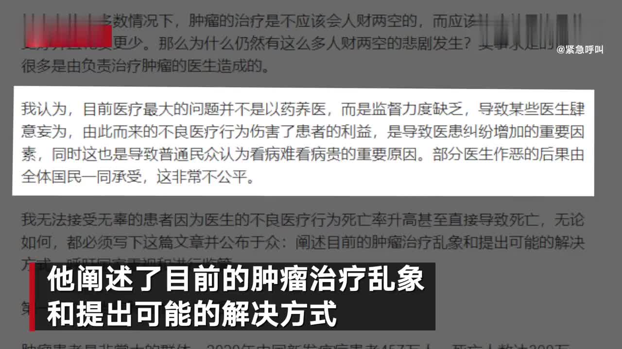 4月18日,自稱北醫三院腫瘤科醫生的網友發帖稱,很多患者人財兩空是由負責治療腫瘤的醫生造成的,原因在於「監督力度缺乏導致某些醫生肆意妄為」。儘管爆料真實性有待調查和權威回應,當事人也因「無法承擔壓力和可能帶來的後果」刪除網帖,但一石激起千層浪,這件事已引發人們對醫療亂象的討論。