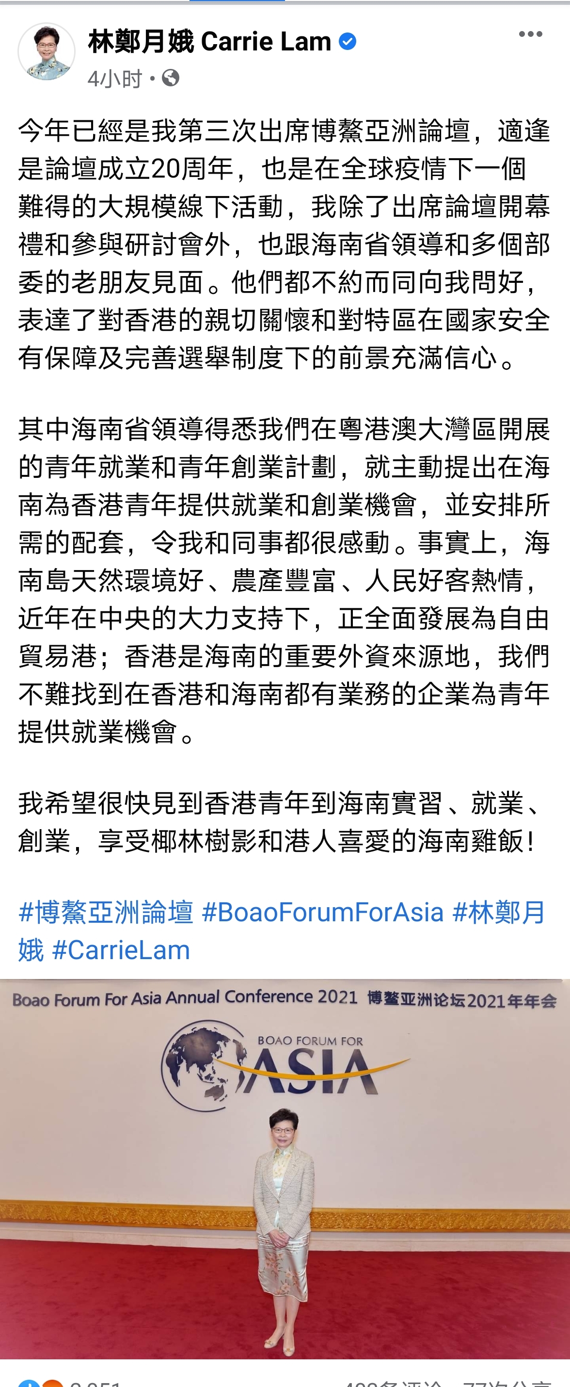 行政長官林鄭月娥21日早結束在海南博鰲亞洲論壇2021年年會的活動後,隨即轉往廣州,準備於22日出席粵港澳大灣區建設領導小組專題會議。她21日在社交媒體發帖文總結出席博鰲亞洲論壇的感受,她表示海南省領導得悉特區政府在粵港澳大灣區開展的青年就業和青年創業計劃,主動提出在海南為香港青年提供就業和創業機會,並安排所需的配套,令她和同事都很感動。