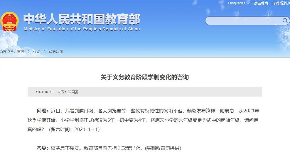 近日,網傳「從2021年秋季學期開始,小學學制將正式縮短為5年,初中變為4年,將原來小學的六年級變更為初中的起始年級」。教育部在回應網民諮詢時表示,該消息不屬實。教育部目前無相關政策出台。