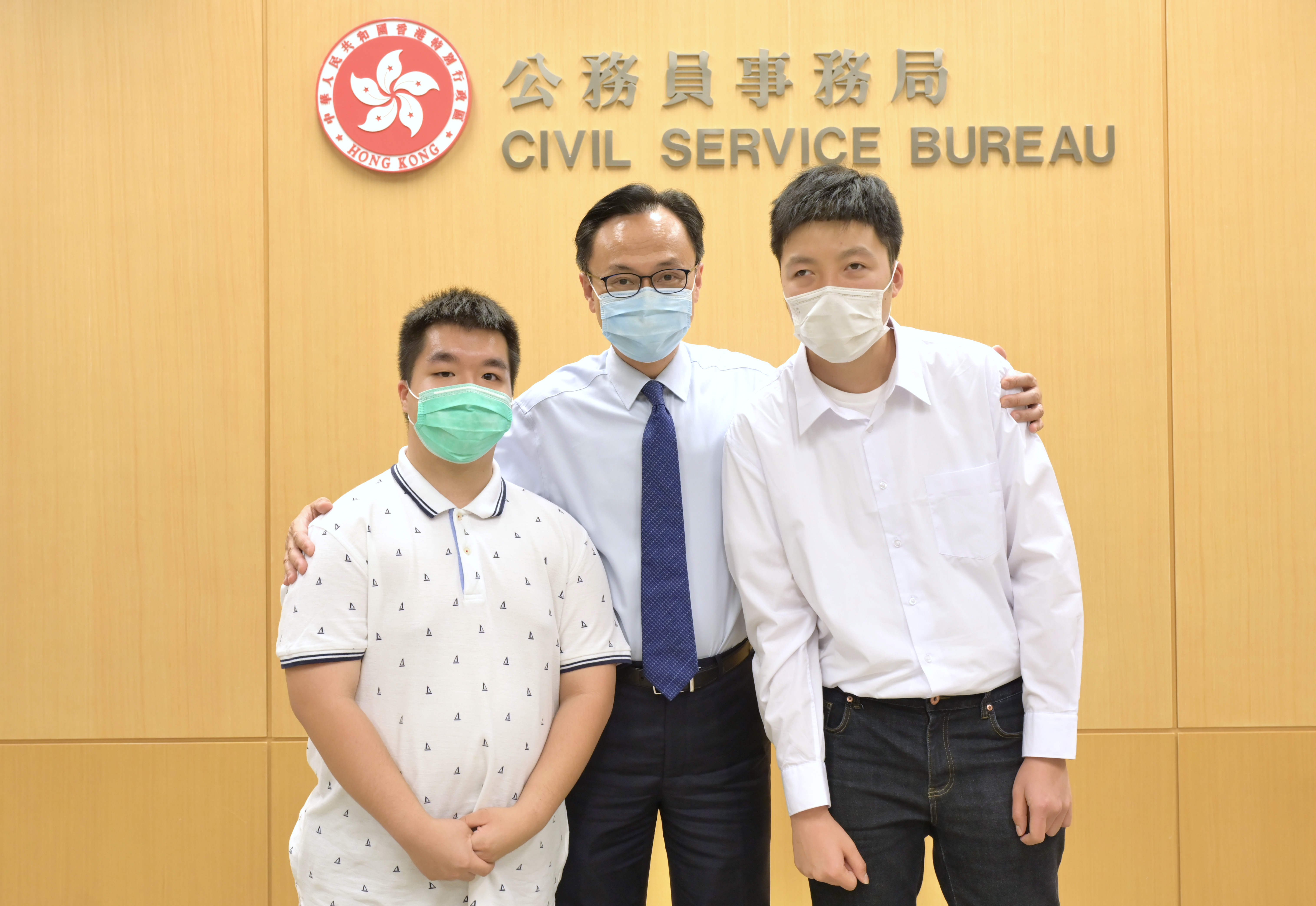 聶德權勉勵學生甄沃弘和黃家俊繼續努力裝備自己。政府新聞處