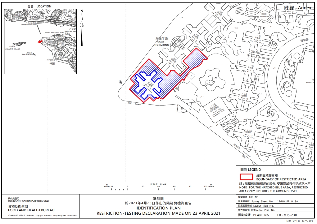 政府今日(23日)引用《預防及控制疾病(對若干人士強制檢測)規例》(第599J章)作出限制與檢測宣告,由下午8時30分起限制在鴨脷洲海怡路10號海怡半島第10座怡麗閣內的人士,須留在其處所並接受強制檢測;受檢人士須於明日淩晨2時前接受檢測。政府指受檢人士須在其處所等候,直至區內所有已識別之受檢人士完成檢測,而相關檢測結果亦已獲大致確定,方可離開其處所;政府目標是在明日(24日)上午約8時左右完成此行動。