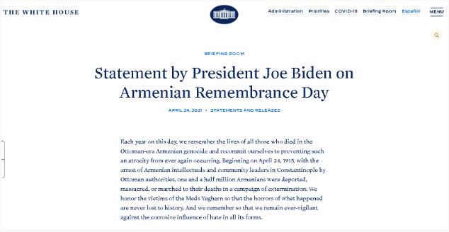 4月24日,美國總統拜登發表聲明:「每年的這一天,我們都紀念在奧斯曼帝國時期針對亞美尼亞人的種族滅絕事件中遇難的所有人,並致力於避免這種暴行再次發生。」