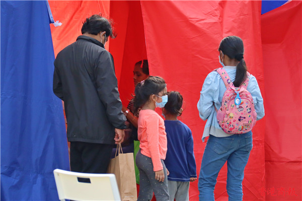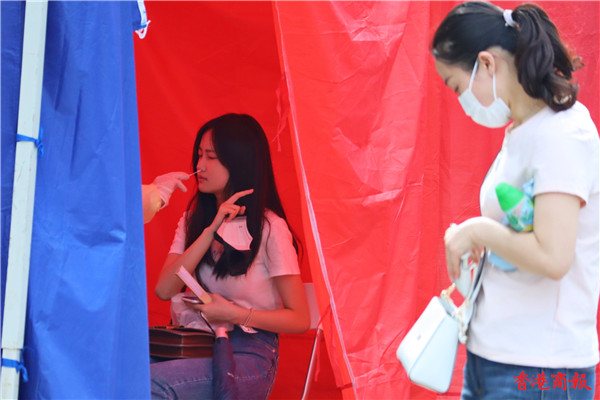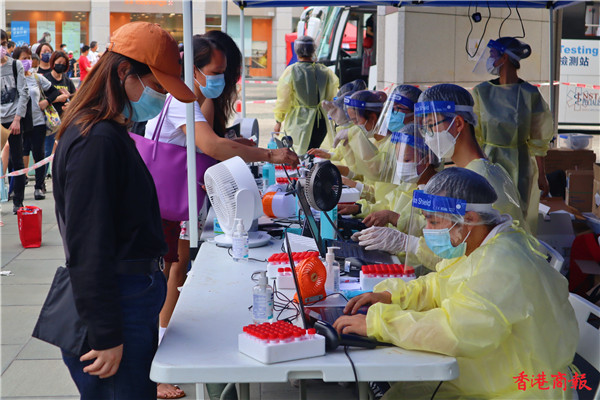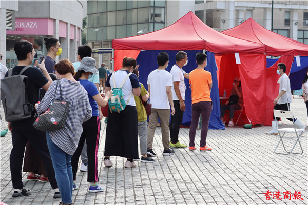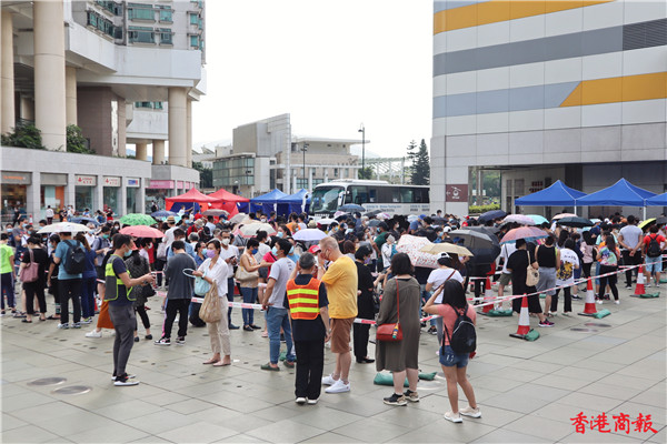 政府將感染變種新冠病毒的東涌外傭,在潛伏期到過的5個地點,列入強制檢測名單,東涌的流動採樣站大排長龍,由於做檢測的人很多,政府將有關的強制檢測公告限期延遲一天至5月2日,讓市民有更大彈性在周日接受檢測,在東涌東薈城外的流動採樣站,做檢測的人大排長龍。(馮瀚文 攝)
