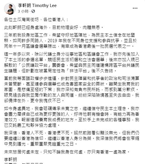 九龍城前區議員李軒朗在社交媒體發表聲明,稱其已經離開香港,但未有透露目前所在地點。