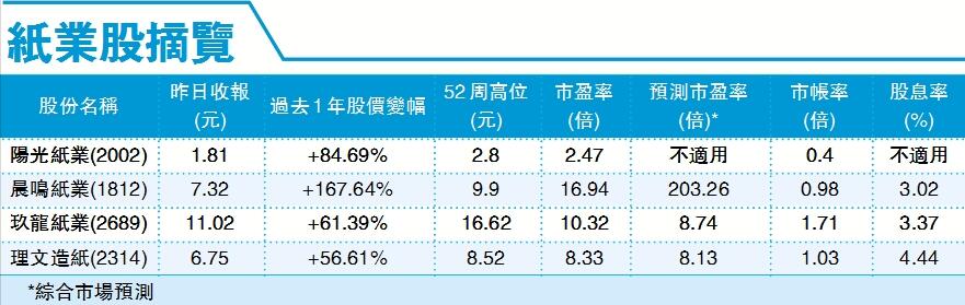 紙漿價格上漲,紙業股也透過加價,將成本轉嫁給消費者,因此營業收入仍可望上升。一眾紙業股昨日隨大市造好。玖龍紙業(2689)、晨鳴紙業(1812)、理文造紙(2314)、陽光紙業(2002)昨日分別升3.38%、9.42%、0.3%、12.42%。