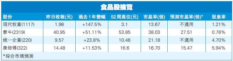 相反,下游的糧油食品股市值較大,企業具規模,股價表現也相對穩健,投資者不妨在投資組合中配置一些糧油食品股,主要憧憬受惠原材料價格上升帶來產品加價潮,同時亦具有內需概念。事實上,不少糧油食品股去年已經歷一輪上漲,但今年以來受整體市況影響出現不同程度調整,不失為趁低吸納機會。