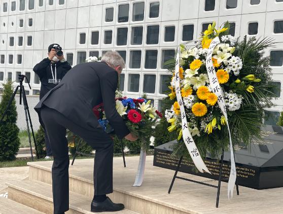 特帕夫切維奇表示,「今天我們來到這裏悼念在北約野蠻侵略中遇難的中國記者,在我們最艱難的時刻中國人民和中國記者同我們站在一起,所以今天我們滿懷無限感激來到這裏向他們致敬。」