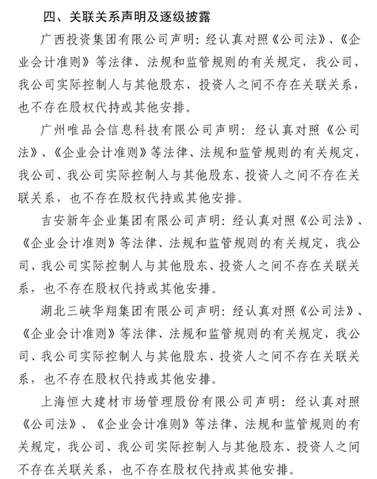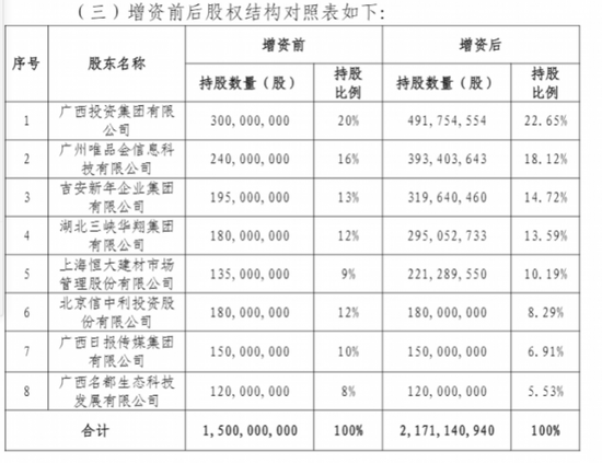 此次增資的對象為持股比例排名前四的四位股東。這其中,股東廣西投資集團有限公司將出資2.86億元,其持股比例將由20%增值22.65%。第二大股東廣東唯品會信息科技有限公司將出資2.29億元,持股比例亦從16%增至18.2%。