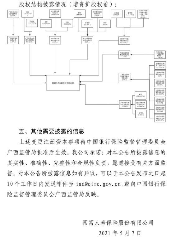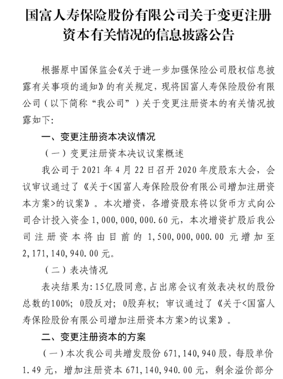 此外,根據披露公告可見,經增資擴股後,國富人壽的注冊資本將從15億元增加至21.71億元。據國富人壽在披露公告中稱,此次增發股份涉及6.7億股,每股單價1.49元,增加的注冊資本為6.7億元,剩餘溢價部分3.29億元計入資本公積。