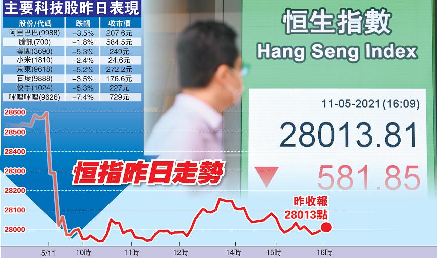 通脹憂慮升溫,風險偏好驟降,近期以美國科技股為首的新經濟股沽壓顯著;同時國際大宗商品價格上行,內地PPI高過預期,亞太股市普遍受壓。受此影響,港股昨在重磅科技股拖累下,收市急挫近600點,收報28013點,見一個半月低位,險守兩萬八心理關。恒生科指爆發小股災,主板成交增至1887億元。分析認為,港股關鍵支持位或退守至27500點,建議月底伺機部署,科技股則短線難抱憧憬。