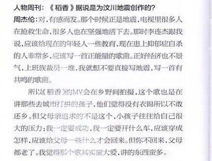 今日,#周杰倫的稻香是寫給汶川地震的#衝上微博熱搜,有微博網友分享《人物周刊》的文字訪問截圖,當時記者提到:「《稻香》據說是為汶川地震創作的?」周杰倫坦言:「對,有感而發。」