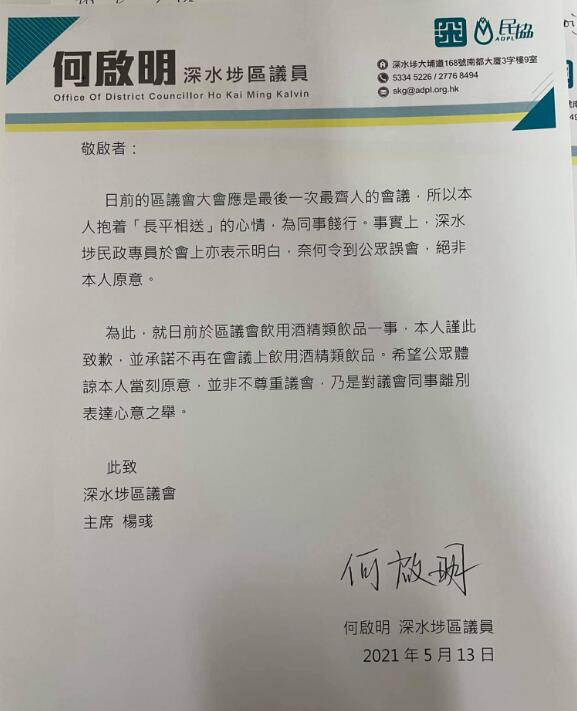 深水埗區議會日前被爆有區議員在開會期間飲紅酒,引發外界批評。其中一名涉事區議員何啟明昨日(13日)向區議會主席楊彧發出道歉信,声稱當日飲酒是希望送別同事,並非不尊重議會。