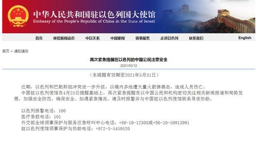 中國駐以色列使館在4月25日提醒基礎上,再次緊急提醒在以中國公民和機構密切關注相關新聞報道和局勢發展,加強安全防範,確保安全。如遇緊急情況,請及時報警並與中國駐以色列使館聯繫尋求協助。(本提醒有效期至2021年5月31日)