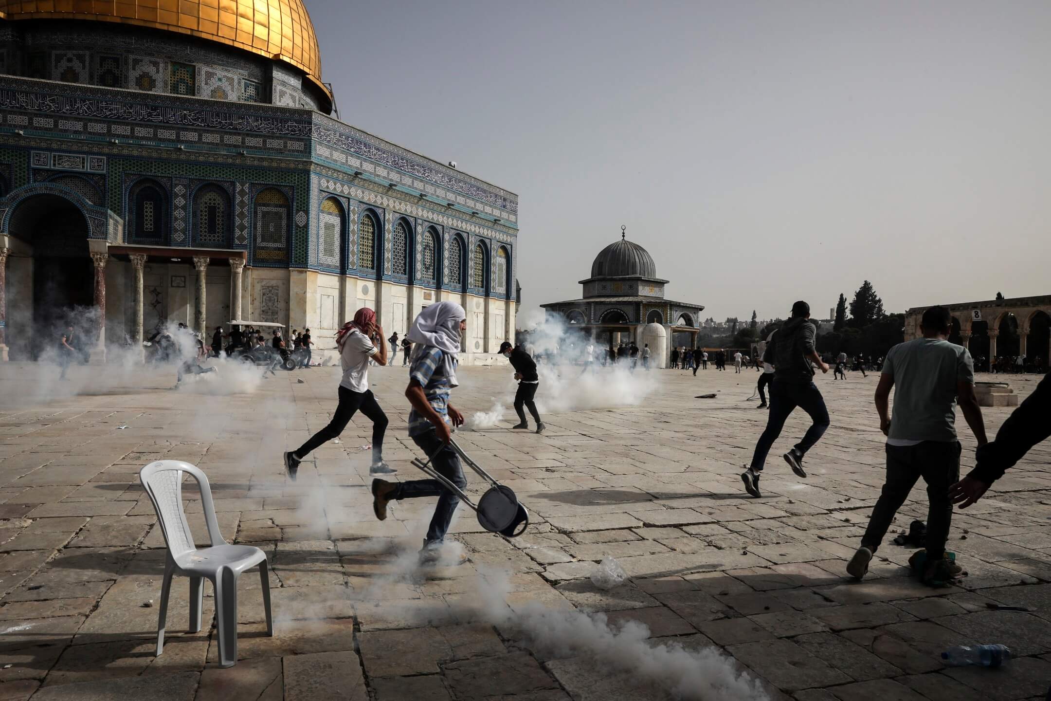 5月10日,耶路撒冷阿克薩清真寺,寺內的巴勒斯坦信眾慌忙走避以色列安全部隊所施放的催淚彈。(圖源:美聯社)