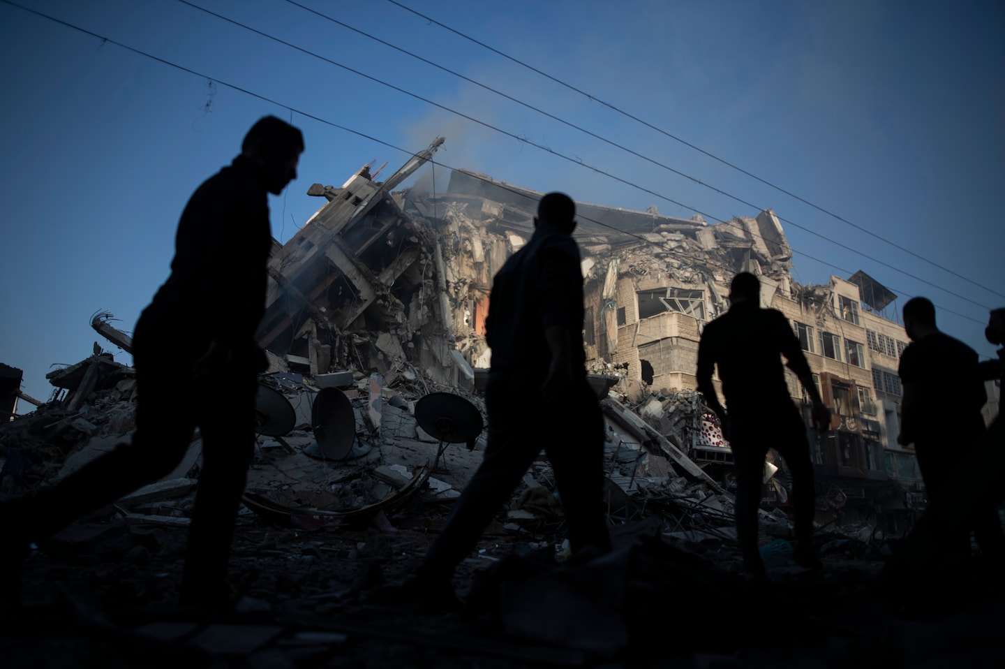 5月13日,巴勒斯坦人走在被以色列空襲摧毀的15層建築物的廢墟上。(圖源:美聯社)