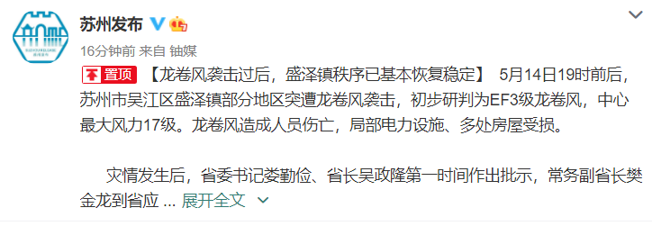 5月14日19時前後,蘇州市吳江區盛澤鎮部分地區突遭龍卷風襲擊,初步研判為EF3級龍卷風,中心最大風力17級。龍卷風造成人員傷亡,局部電力設施、多處房屋受損。