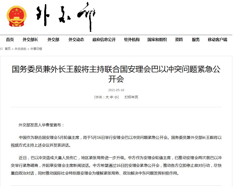 中國作為聯合國安理會5月輪值主席,將於5月16日舉行安理會巴以衝突問題緊急公開會。國務委員兼外交部長王毅將以視頻方式主持上述會議並發表講話。