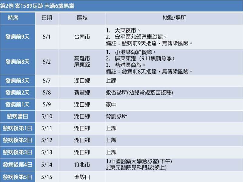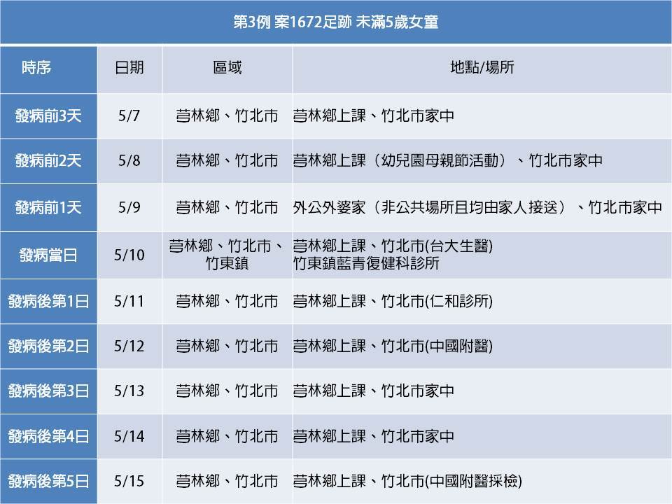 案1589則在5月10日發病,並到當地的診所就診,5月1、2日曾到台南、高雄、屏東旅遊,8日到新豐鄉一間診所打常規疫苗,7日、11至13日都到幼兒園上課,9日在家休息,14日下午、晚上分別到竹北的2間醫院就醫,15日確診;案1672則住在竹北市,5月10日發病,發病當天到竹北的醫院就診,還去了竹東的復健科診所,15日在竹北的醫院進行採檢,7日、8日及10日至15日都有到芎林鄉的幼兒園上課、參加幼兒園假日活動,9日跟着家人回外婆家,11日及12日分別到竹北2家醫療院所就醫。