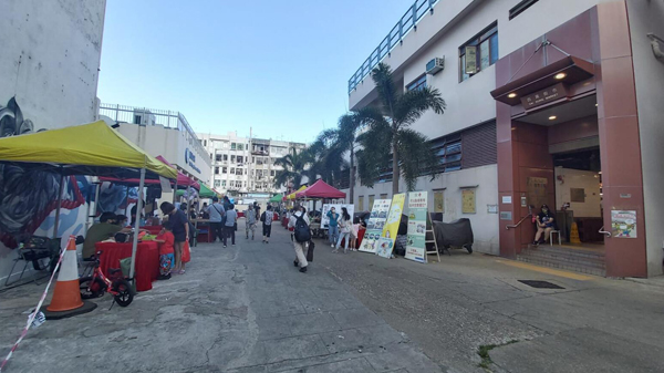 監察公營街市發展聯盟與社區發展陣線等團體在15日舉行「街市研習室」活動,於西貢街市對出空地設有6個墟市攤位、歷史文化探索團和街市設計師等活動。
