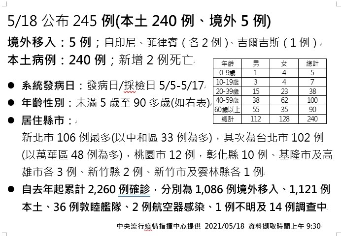 新冠肺炎社區流行疫情嚴峻,根據台灣地區流行疫情指揮中心今天(18日)統計,已有1121例本土病例,已超過境外输入,同時新增2例死亡,至今累積14人病歿。据统计,台湾近4天新增959例本土案例。