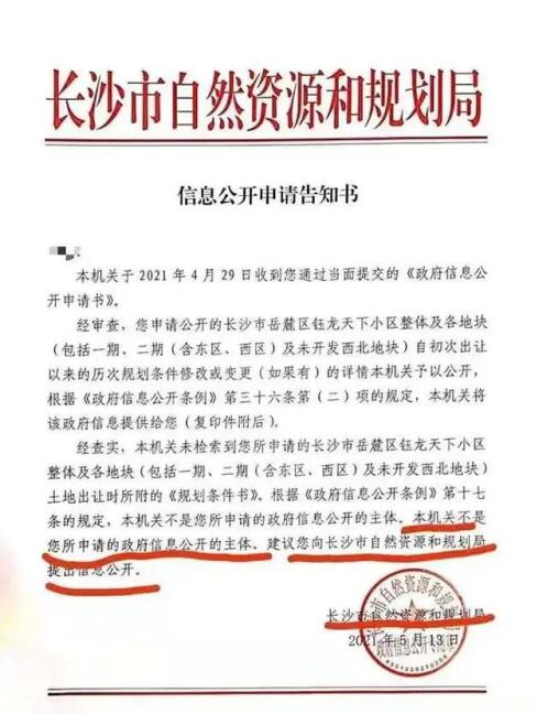 5月15日,一份蓋有「長沙市自然資源和規劃局政府信息公開專用章」的《政府信息公開告知書》,其中出現了「本機關不是您所申請的政府信息公開的主體,建議您向長沙市自然資源和規劃局申請信息公開」的不恰當表述,並且出現文字重複、把關不嚴的問題,引發了社會的關注和質疑。
