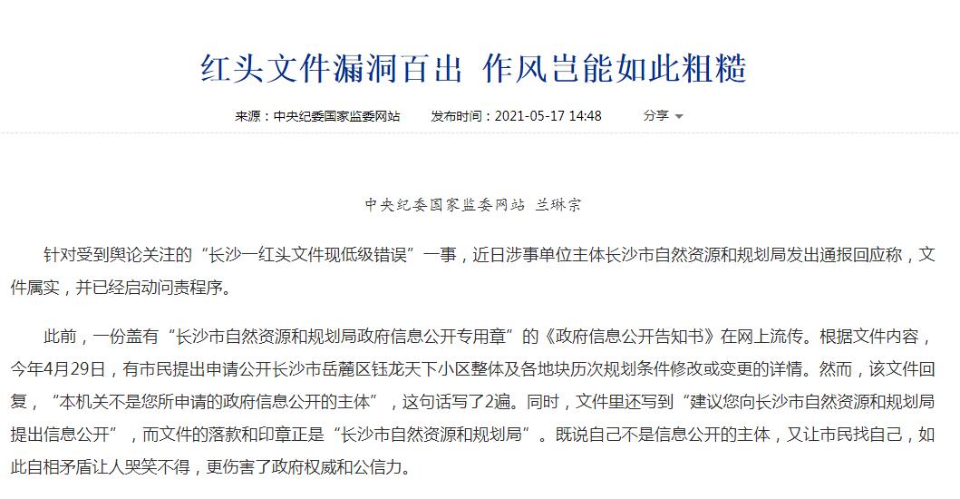 對此,中央紀委國家監委也發文指出,針對受到輿論關注的「長沙一紅頭文件現低級錯誤」一事,近日涉事單位主體長沙市自然資源規劃局發出通報回應稱,文件屬實,並已經啟動問責程序。