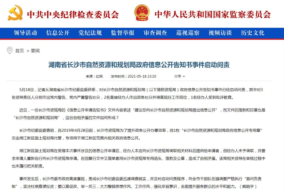 據红网報道,5月18日,湖南省長沙市紀委對長沙市自然資源和規劃局(以下簡稱資規局)政府信息公開告知書事件已經啟動問責,其中對3名領導責任人分別作出黨內警告、黨內嚴重警告處分,2名直接經辦人作出政紀處分並調離現任工作崗位,1名經辦人受到批評教育。