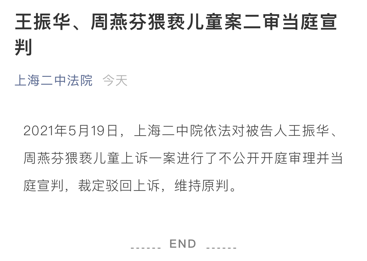 上海二中法院微信公眾號消息,2021年5月19日,上海二中院依法對被告人王振華、周燕芬猥褻兒童上訴一案進行了不公開開庭審理並當庭宣判,裁定駁回上訴,維持原判。