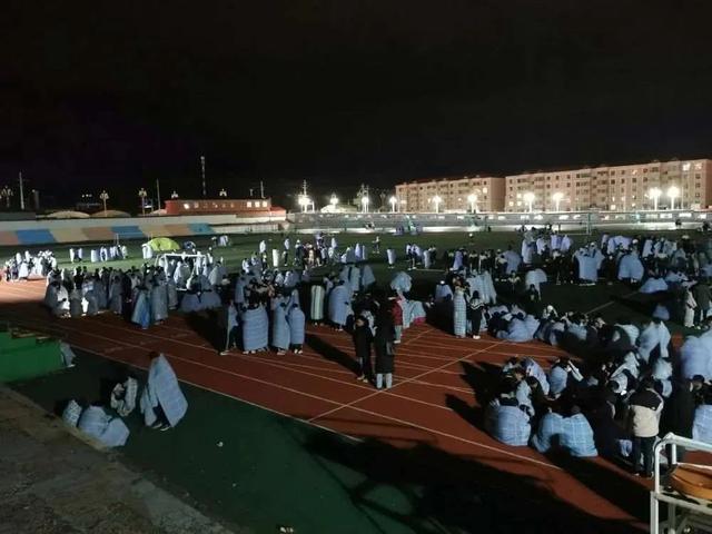5月22日淩晨,在青海省果洛藏族自治州州府瑪沁縣,果洛州民族高級中學的學生在操場避險。