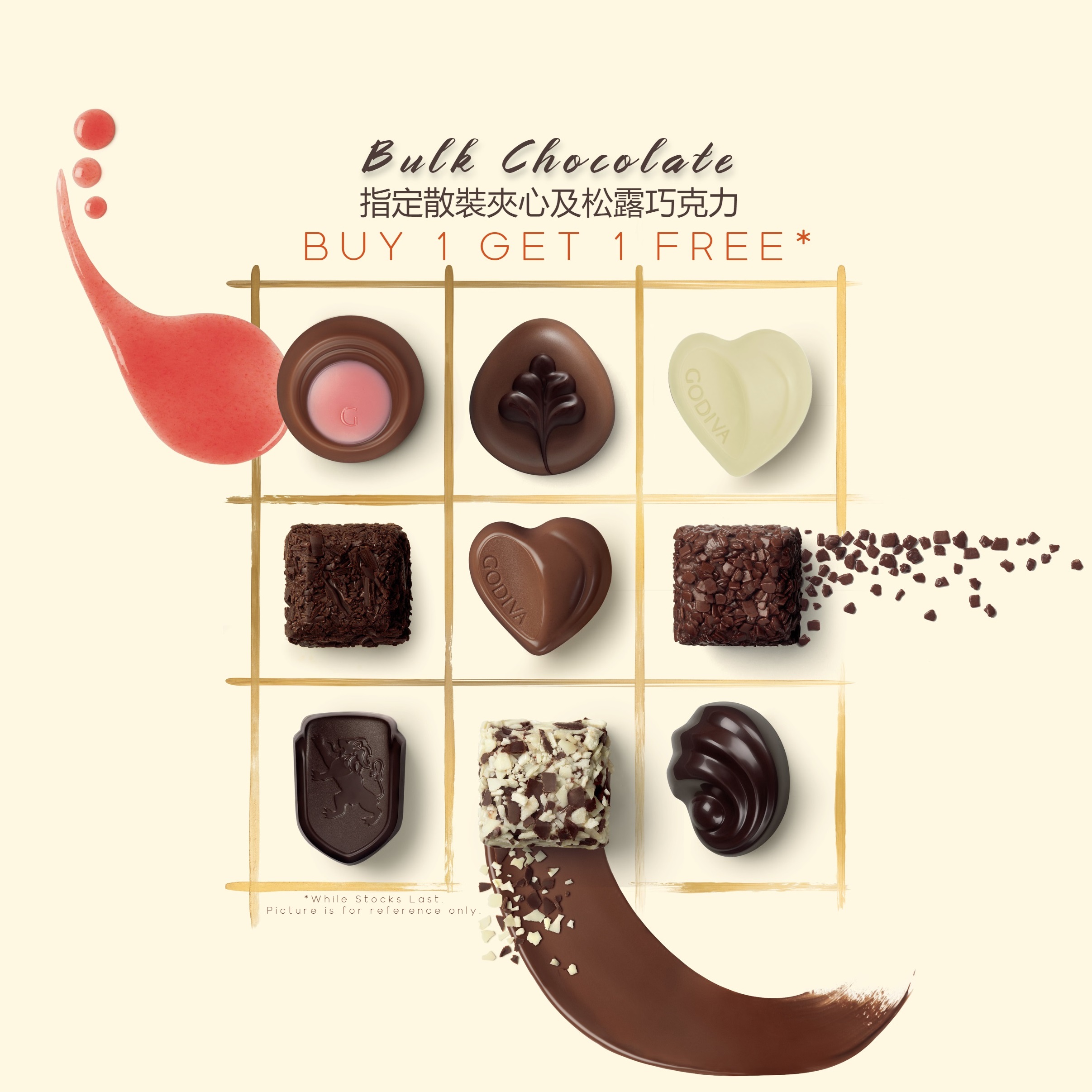 高級朱古力品牌GODIVA推出買一送一優惠,即日起至5月23日,散裝夾心及松露朱古力買一送一,指定季節限定Carré片裝朱古力則買十送十,想一嘗比利時朱古力的魔力,就要把握最後2日機會。