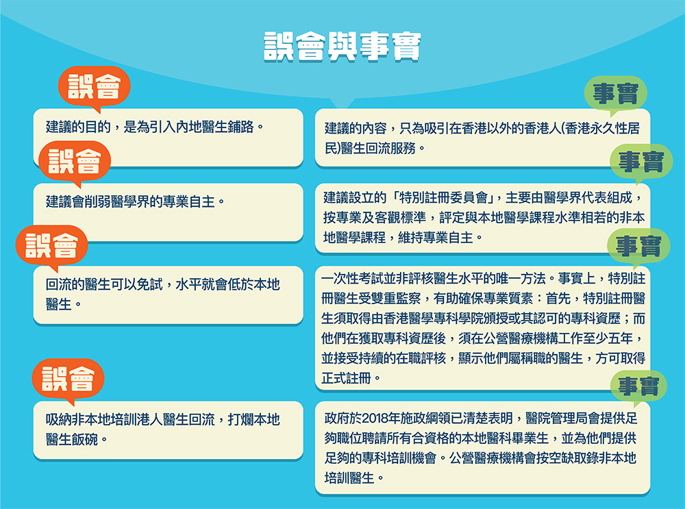 針對社會上的一些誤解,陳肇始強調,建議並無繞過醫委會,日後循新途徑來港執業的非本地培訓醫生仍須向醫委會註冊,並如其他本地醫生一樣受醫委會的紀律監管。食物及衞生局局長亦不會利用權力影響認可學院名單。