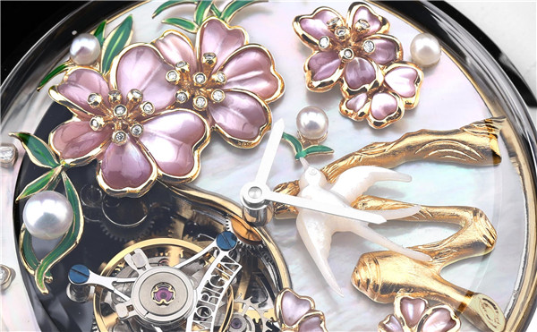 新表設計着重立體感,工匠以人手把白色的珍珠貝母雕刻成飛翔的燕子,把粉紅色貝母打造為一片片花瓣,加入美鑽為花蕊,立體感十足。表盤飾以6顆大小不一的日本Akoya天然珍珠,為配合腕表厚度及尺寸,「Yuan Jewelry」搜羅直徑只有2-4毫米、亮澤正圓的珍珠作為配飾。為了紀念是次合作,余嫿巧妙地把「Yuan Jewelry」的標誌融入到樹枝的設計中,代表三方聯乘。